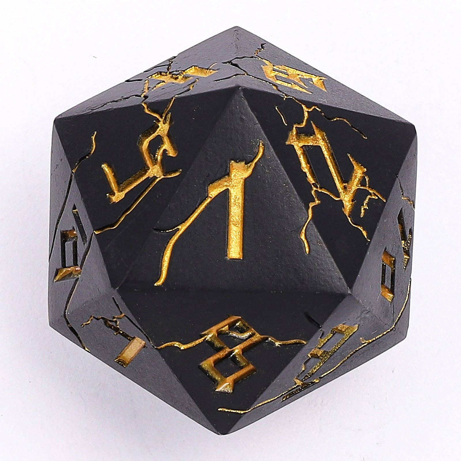 Make a statement in your games with this large Spindown D20. Single D20 dice in Matt Black with Gold. Pattern: Barbarian