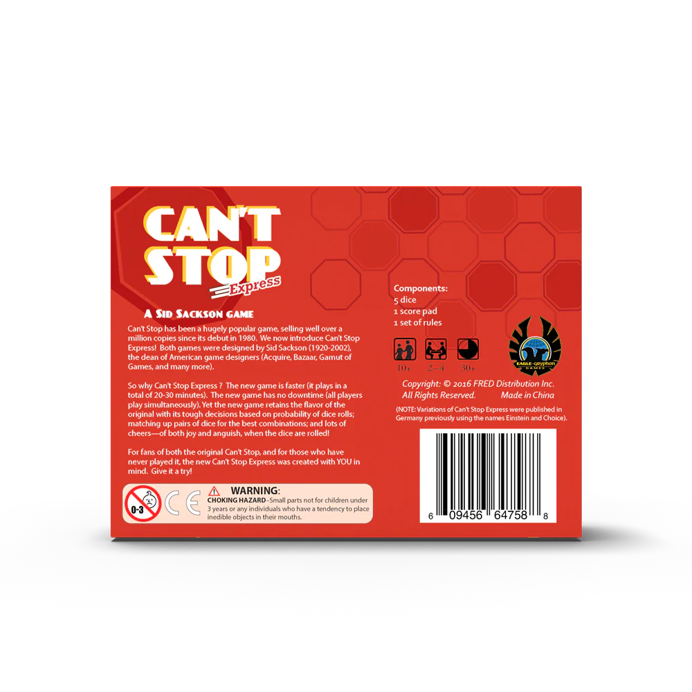 Can't Stop Express is an exhilarating dice game that combines fast-paced action with strategic choices. Designed by Sid Sackson, this easy-to-learn game challenges you to pick the best pairs from five dice rolls to score points before the timer die ends the round. Every decision tests your balance of risk and reward, making each roll thrilling. Perfect for friends and family, it promises hours of excitement as you race to the finish line. Dive into this addictive game and see if you have what it takes to outsmart your opponents and claim victory!