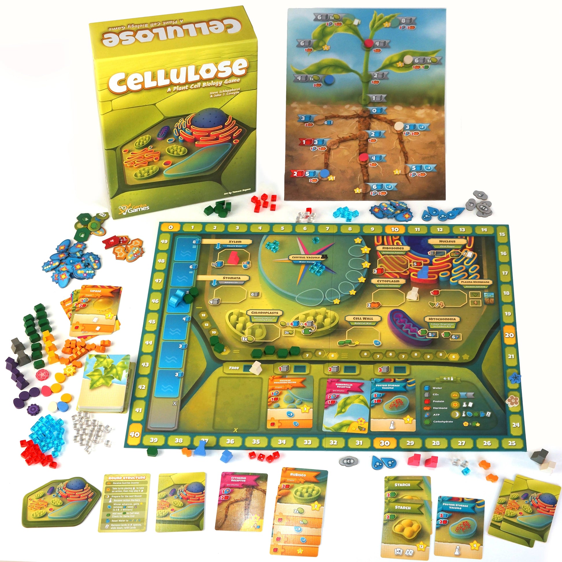 Cellulose: A Plant Cell Biology Game is a worker placement game that puts 1-5 players inside a plant cell, where they compete over limited resources to undergo photosynthesis, produce carbohydrates, and build the cell wall to score points. With everyone vying for the same actions, players must carefully time their use of proteins, hormones, and cell component cards to diversity their strategies and outplay the competition!