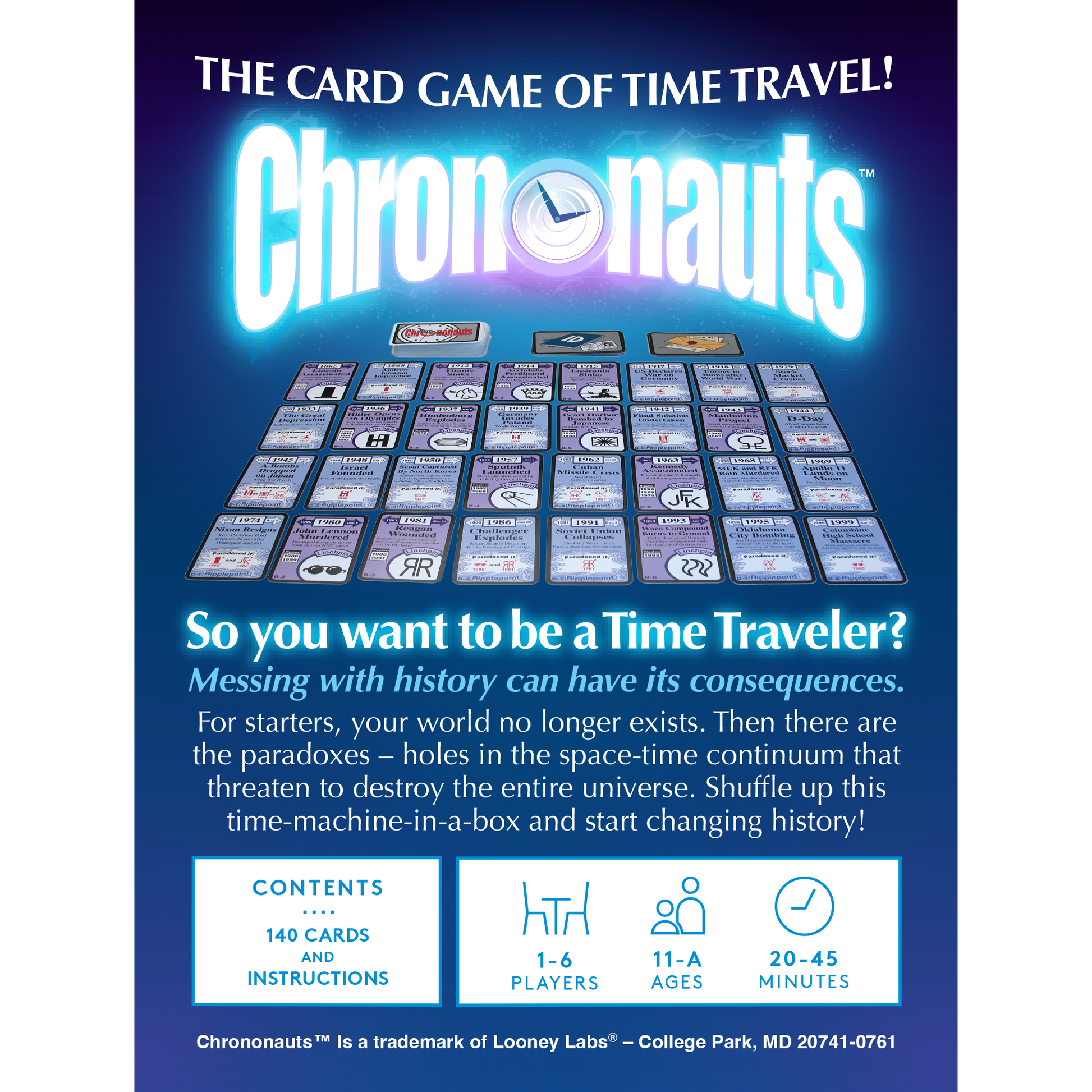What would YOU do with a Time Machine? Would you stop the sinking of the Titanic? Prevent the assassination of JFK? Kill Hitler before WWII? These are just a few of the possibilities in Chrononauts, the award-winning card game of time travel. To win, you must change history at key points called Linchpins, so that history transforms into the Alternate Reality your character calls home. You can also win by collecting a specific set of Artifacts, such as a live dinosaur, the Mona Lisa, and an unpublished Shakespearean play. But be careful - if you create too many paradoxes, you could destroy the entire universe!