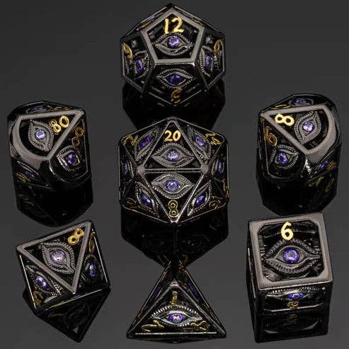 Set of 7 polyhedral dice in black metal with purple gems. These are excellent gifts for Mother’s or Father’s Day, Graduation, Weddings, Birthdays, Easter, Christmas, or any other gift occasion! Afterall dice last longer than candy or chocolate. Perfect for Dungeons and Dragons, Pathfinder, Wargaming, along with many other games and hobbies! Pattern: Dragon's Eye Hollow