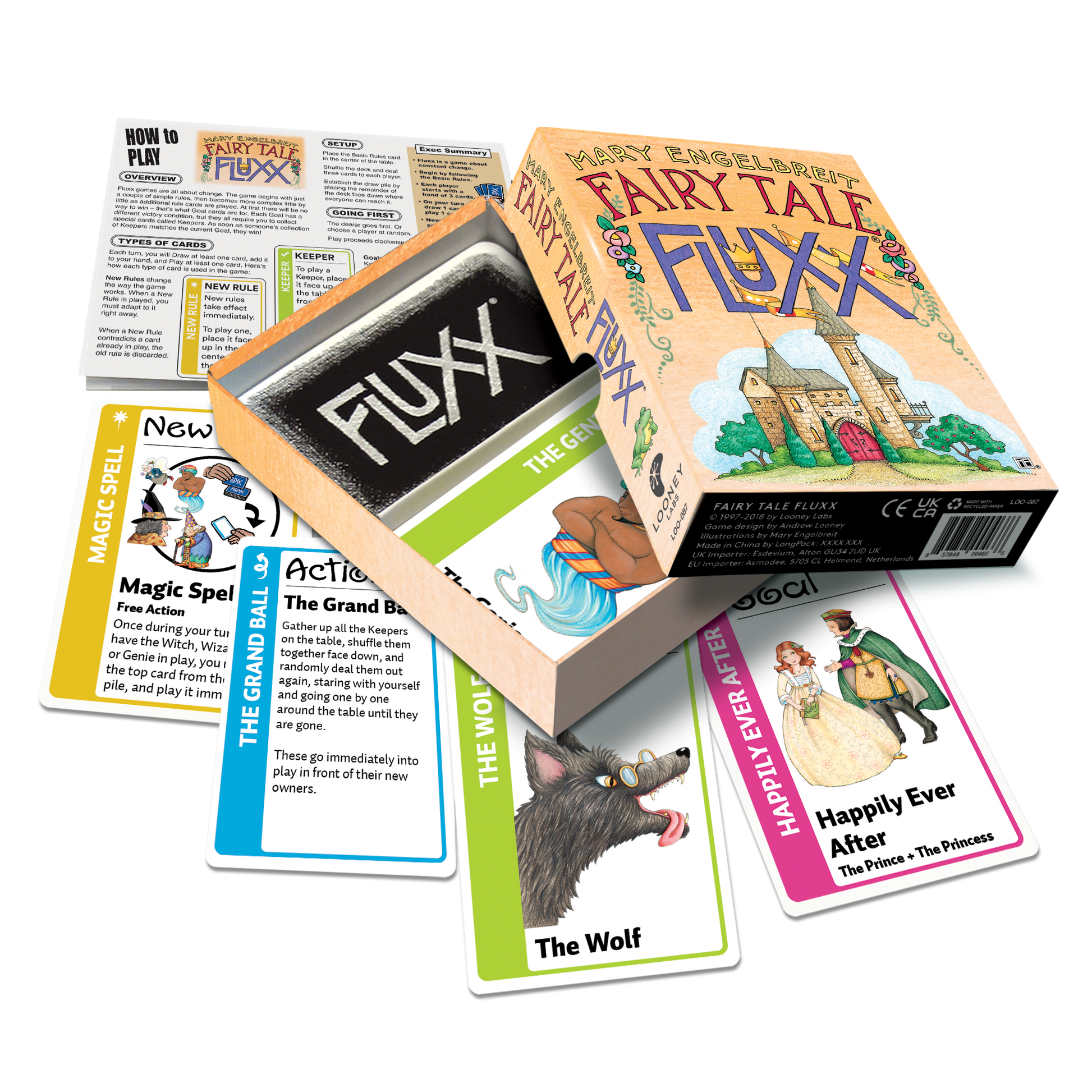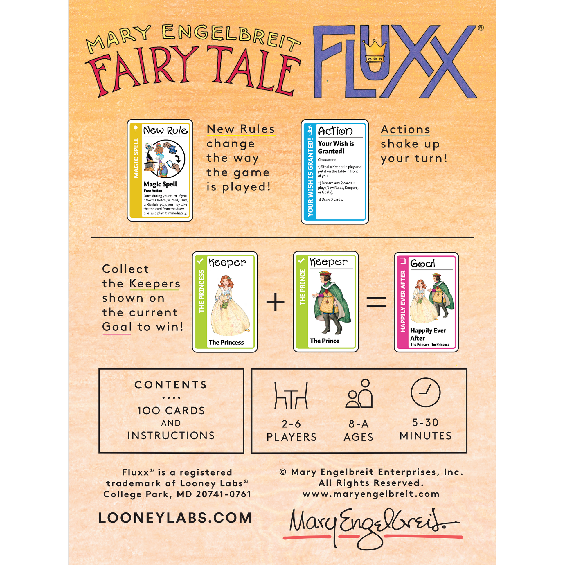 Fairy Tale Fluxx brings the zaniness of the card game of ever-changing rules to the land of happily ever after! Gather Keepers to fit the current fairy tale Goal and you win. Though there are no Creepers, you'll still have to look out for the Witch and the Wolf! With delightful illustrations by Mary Engelbreit, this version of Fluxx is a wish come true.