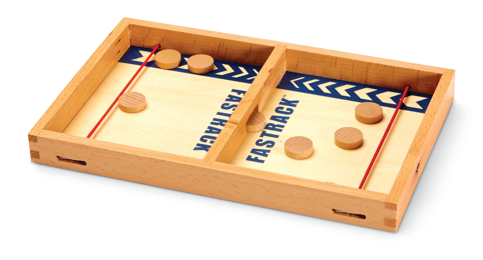 Ready, aim, score! In fastrack, each player uses the elastic band to send their five discs zooming through a tiny slot to the other side of the track. Players need to work fast and aim well as they simultaneously fire at each other. The player who sends all ten discs to their opponent's side wins! Ready, aim, score!