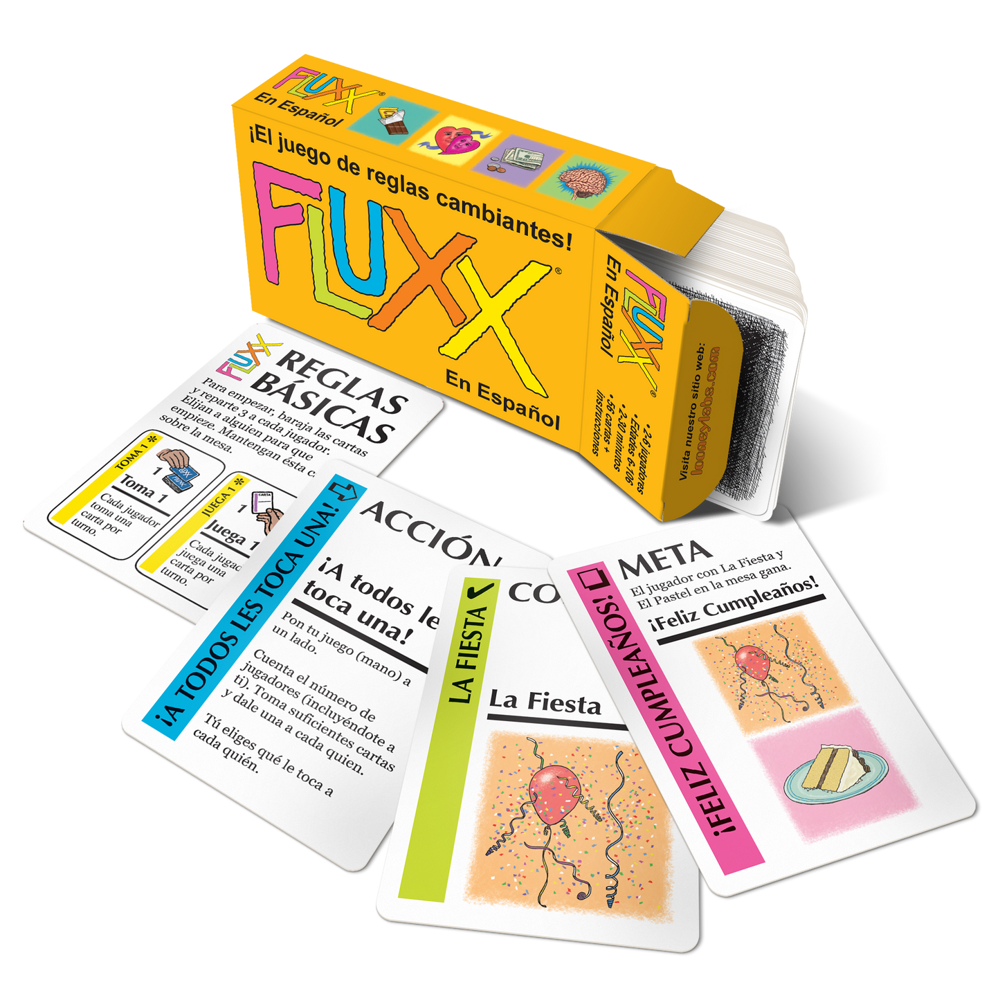 Fluxx Español is the only non-English version published by Looney Labs itself. It features a full Spanish translation of cards and rules, beautiful color artwork, and streamlined card design. A slightly smaller deck than original Fluxx, with only 52 cards based loosely upon Fluxx 3.0 and with easier gameplay.
