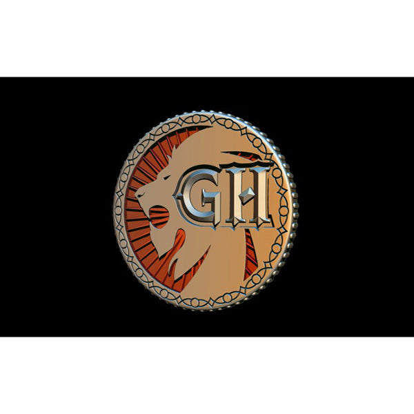 38mm metal coin with colored enamel highlights, featuring symbology and coloring from Gloomhaven.