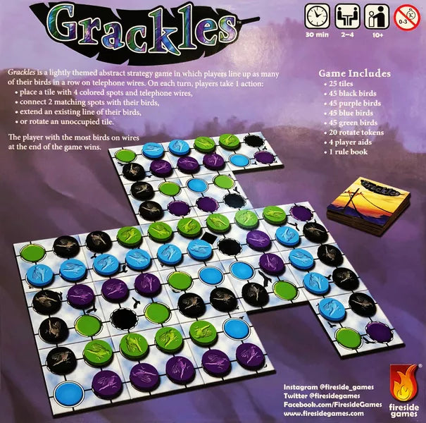 Grackles is a lightly themed abstract strategy game in which players line up as many of their birds in a row on telephone wires.