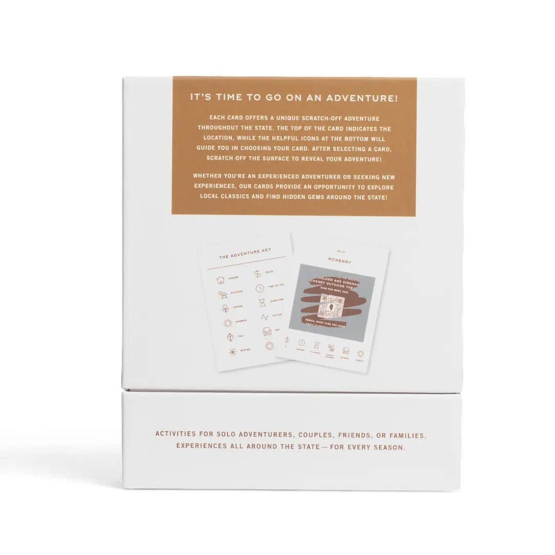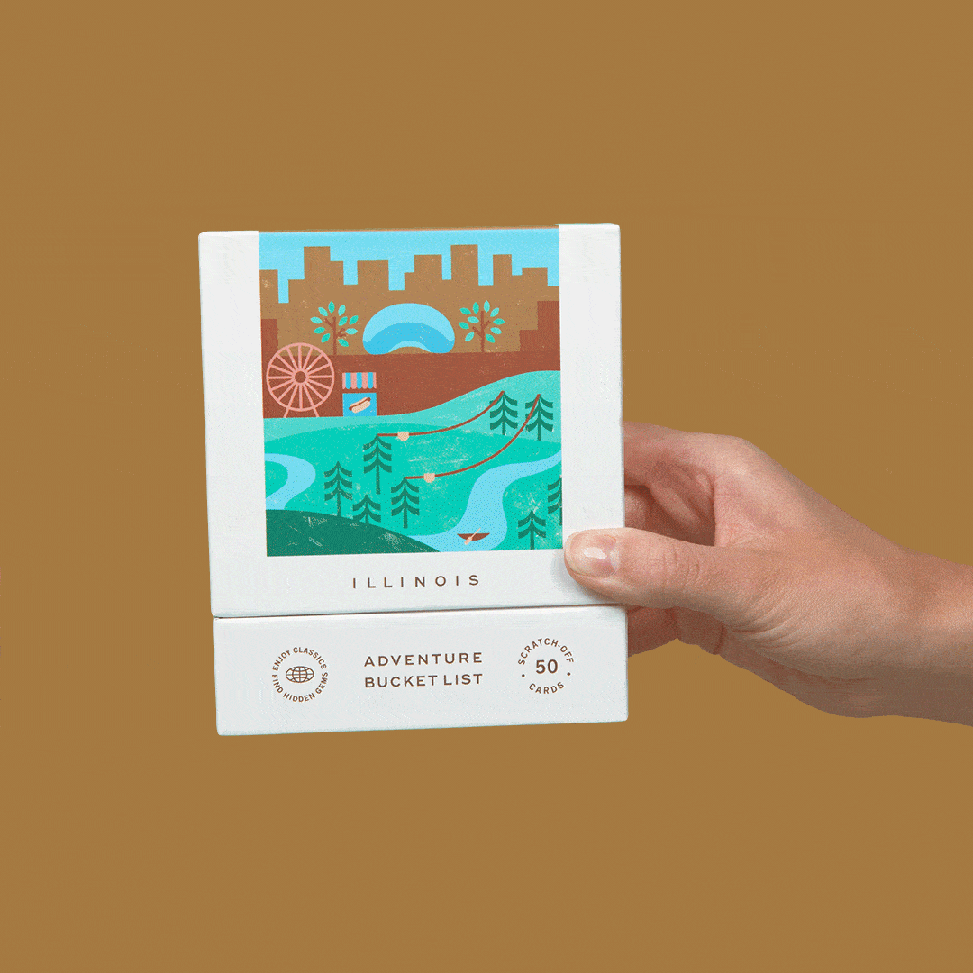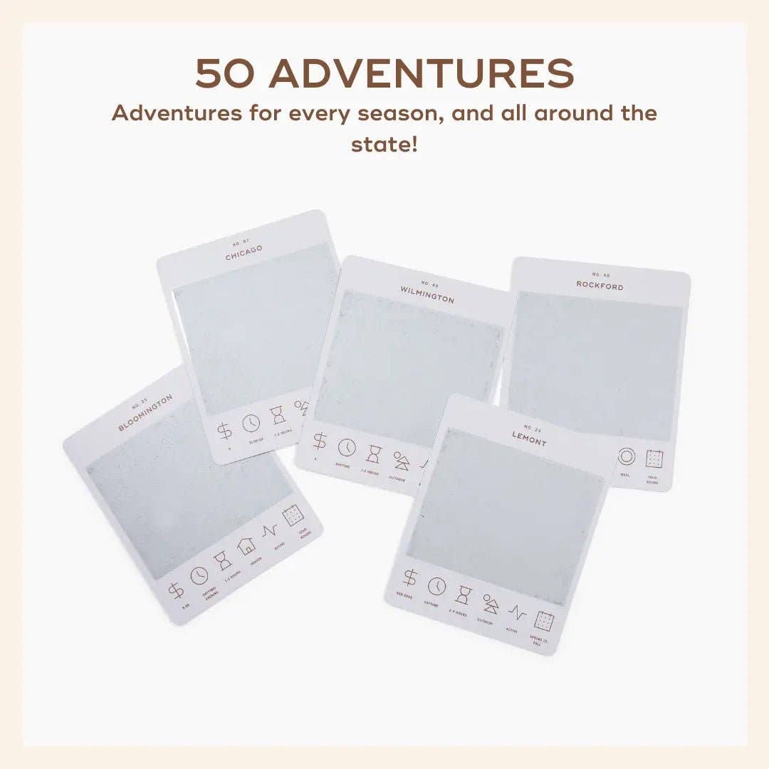 50 scratch off bucket list adventures around the state of Illinois. Pick a city that you want to explore, check out the icons at the bottom of the card to determine the season, cost, and time of day, and then scratch off the card to reveal your adventure!
