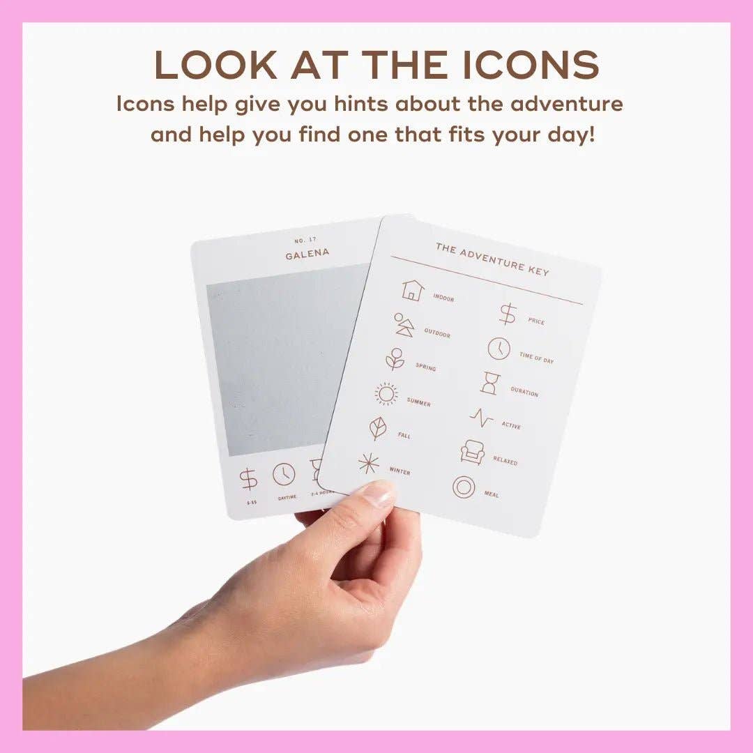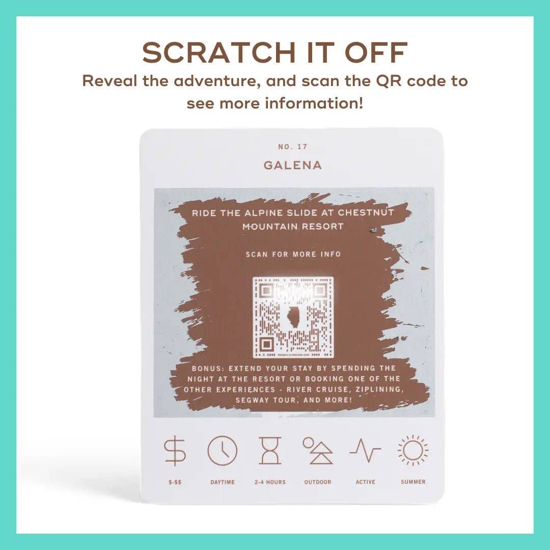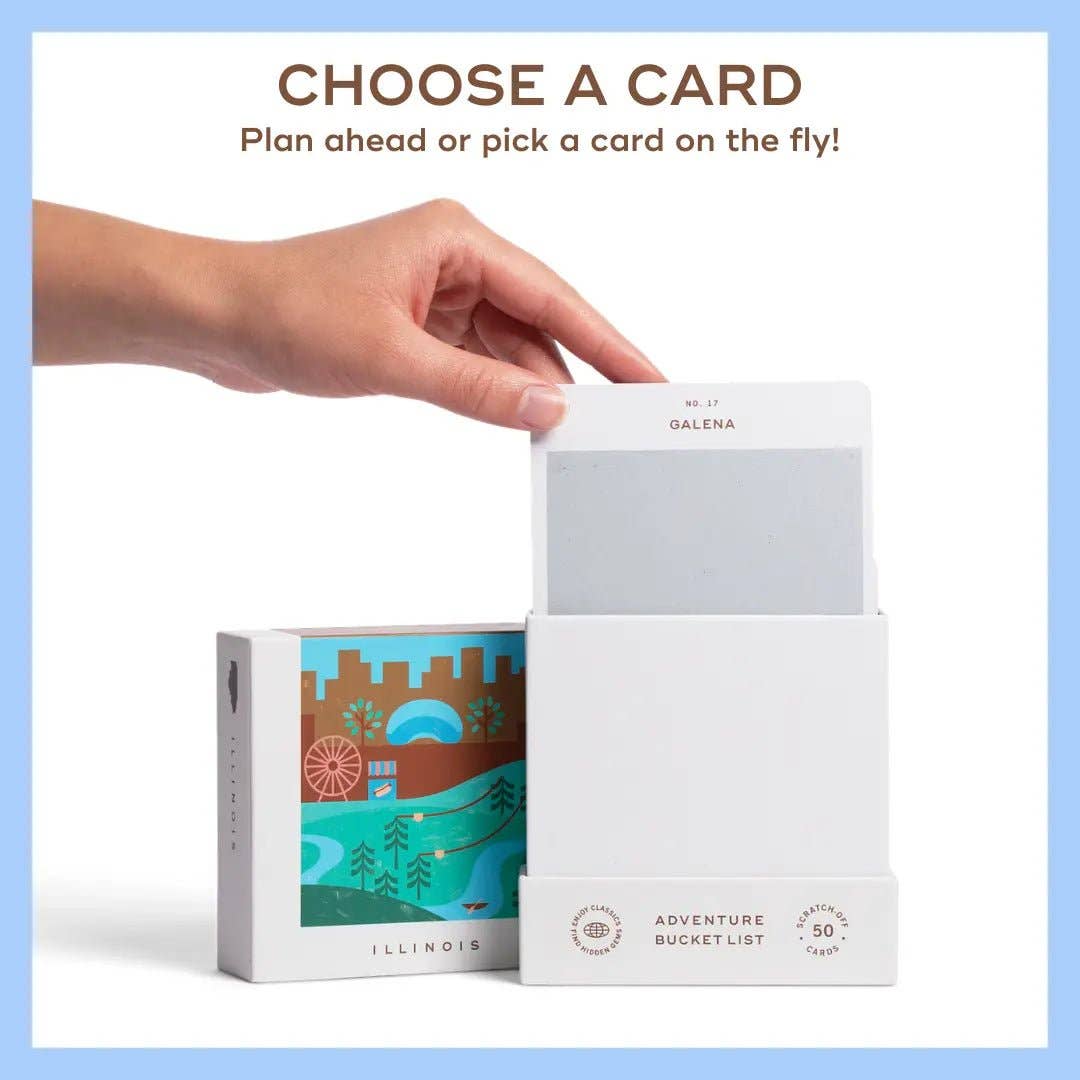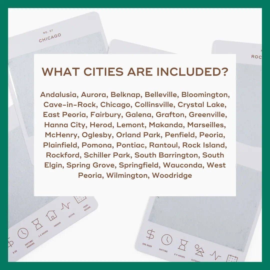 50 scratch off bucket list adventures around the state of Illinois. Pick a city that you want to explore, check out the icons at the bottom of the card to determine the season, cost, and time of day, and then scratch off the card to reveal your adventure!
