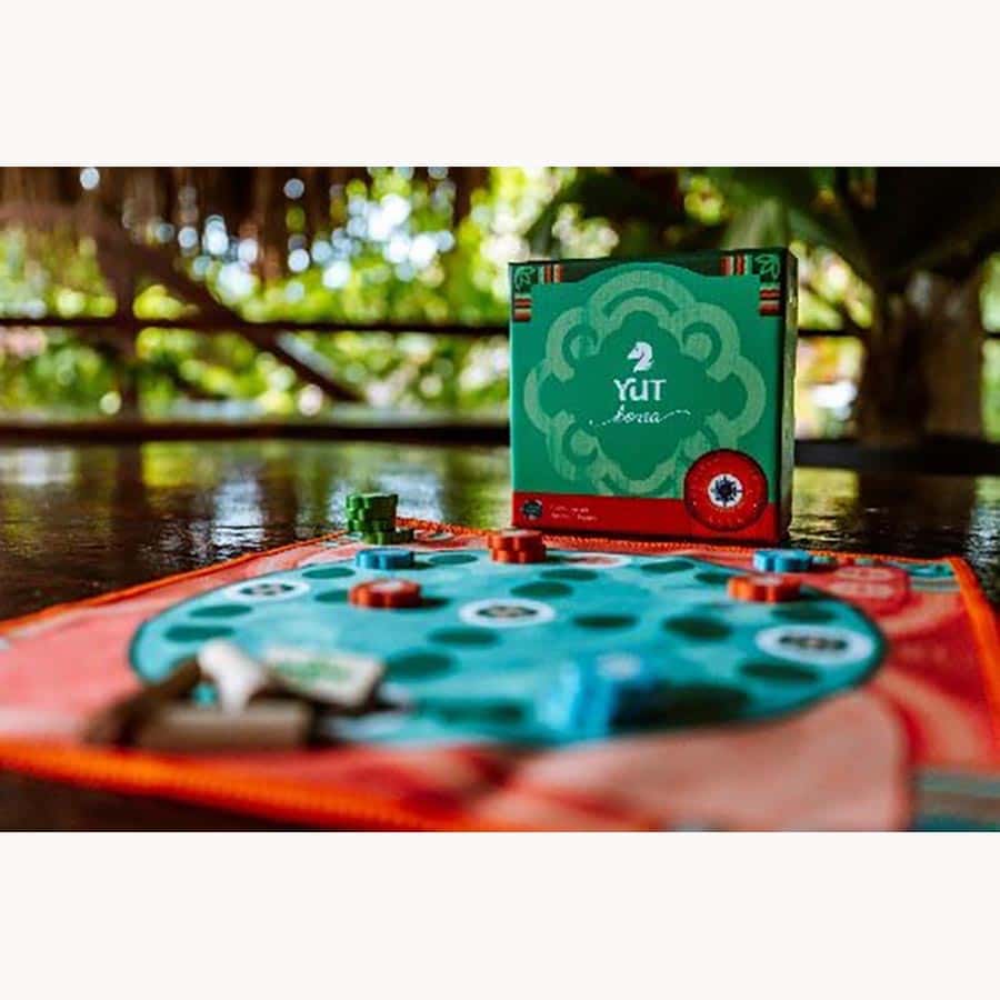 A race game which originated in ancient Korea. The 29 spaces on the board form a cross inside a circle. The spaces on the circle at the four intersections with the arms of the cross have special functions. One of these spaces is the entry and exit space, the others allow a horse landing on them to shortcut through the middle of the circle. The object is to be the first to get all of your horses around the circle and off the board.