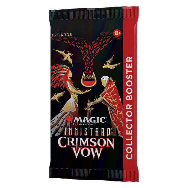 Each Crimson Vow Collector Booster contains 15 Magic: The Gathering cards and 1 Traditional Foil double-sided token, with a combination of 5 cards of rarity Rare or higher and 4 Uncommon, 5 Common, and 1 Land cards. Every pack contains a total of 10–12 Traditional Foil cards.