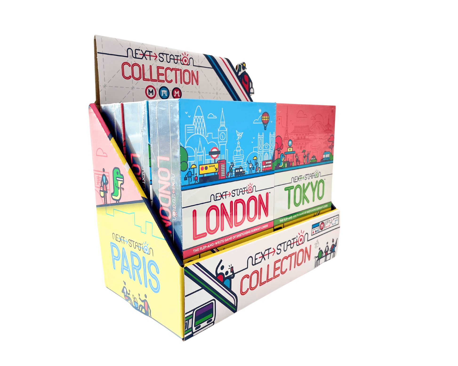 The flip-and-write game of sketching subway lines! Travel to the city of Tokyo, Japan and compete to redraw their metro plans in order to meet the tourist challenges of tomorrow. Each turn you will reveal the next station card and draw a subway line on your map. You will have to optimize your network to collect a maximum of stamps and stay connected to the central green loop to earn as many points as possible! This flip-and-write game follows the highly acclaimed Next Station London released in 2022 with a similar mechanic and all new challenges! The flip-and-write game of sketching subway lines!