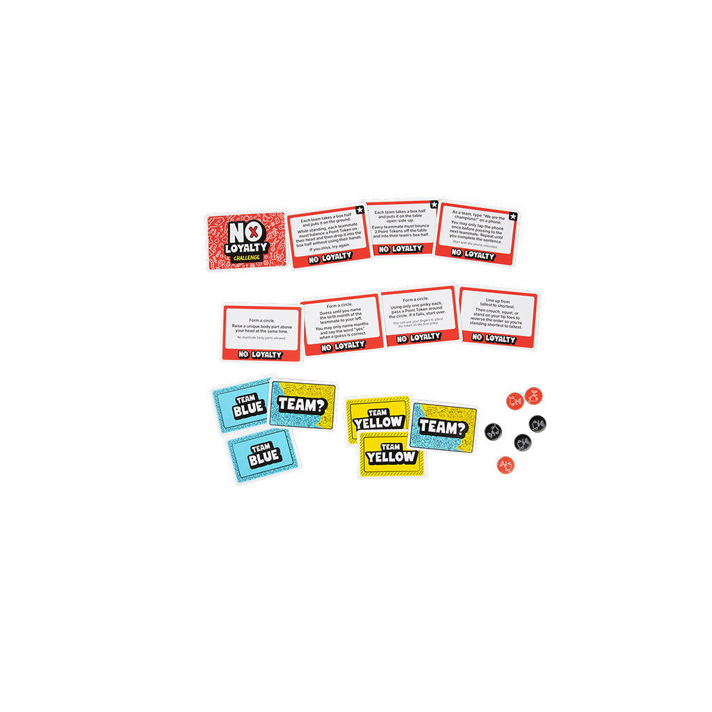 Teams Change Every Round, Players Have No Loyalty! No Loyalty is a chaotic, laugh-out-loud party game where teams shuffle every round, alliances are temporary, and only one player walks away with five tokens and ultimate bragging rights. Flip, team up, complete the challenge, and betray again next round.