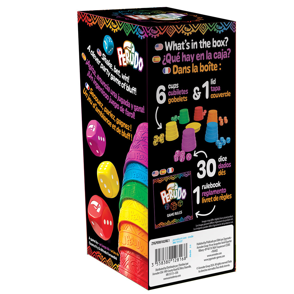 In this game of betting and bluff, each player gets a color-coordinated set of a cup and five dice. Roll the dice, bet on the outcome and be the best bluffer to win!