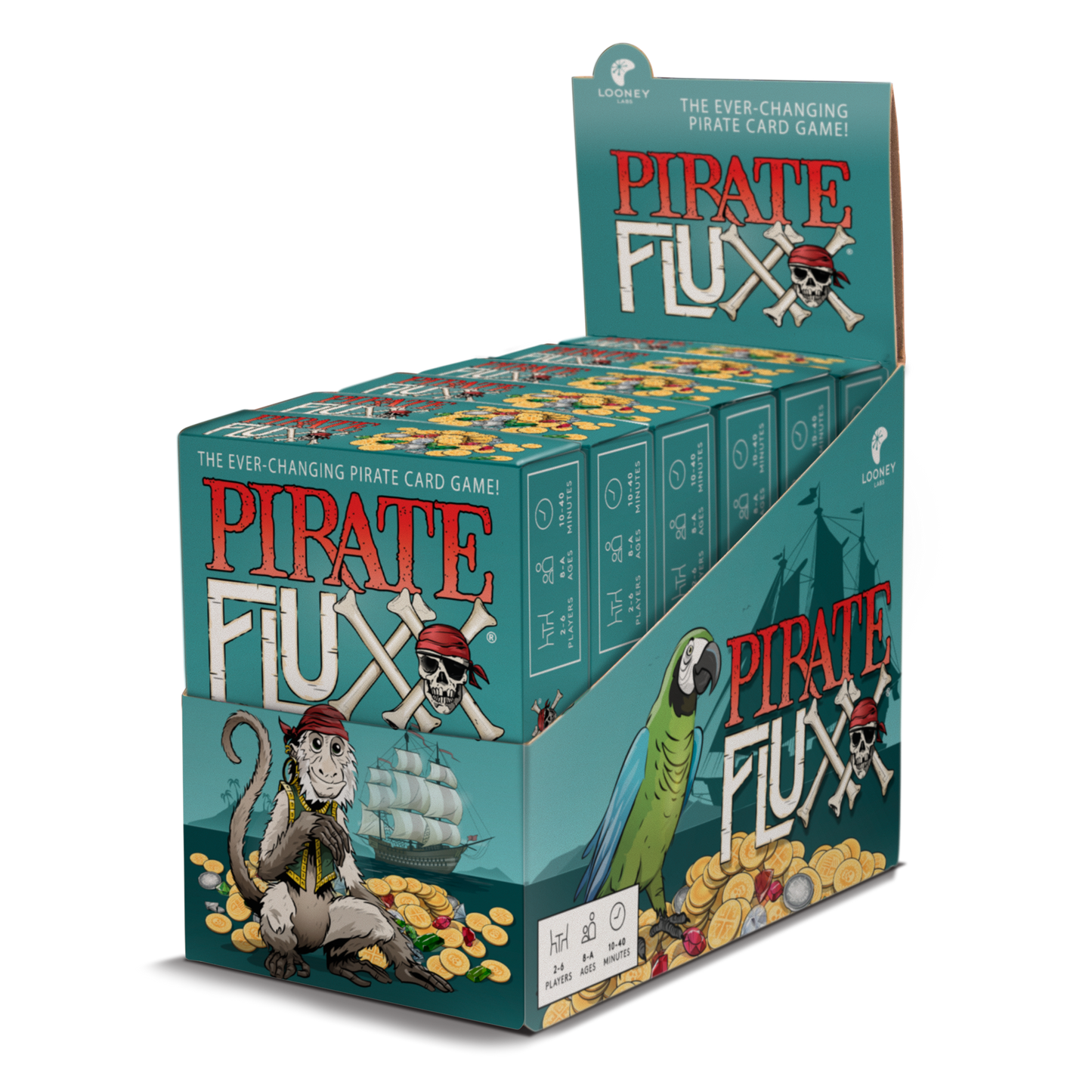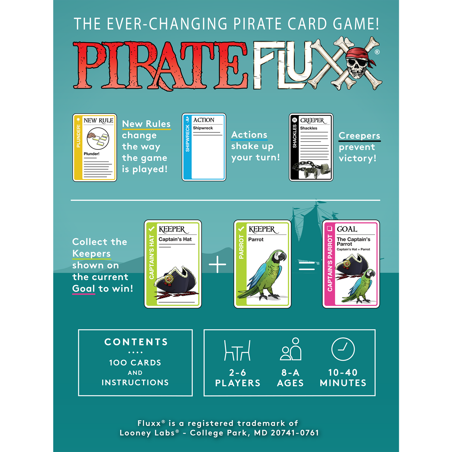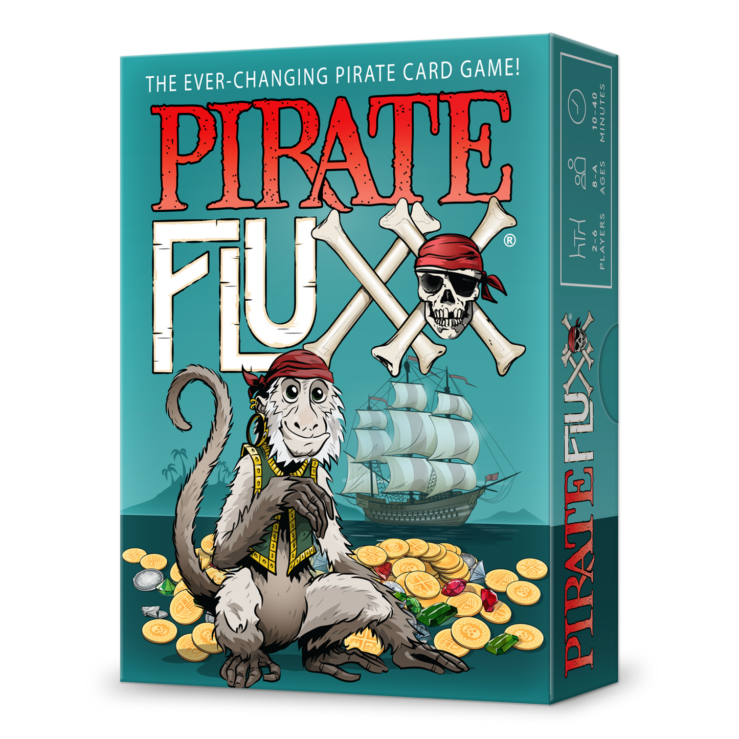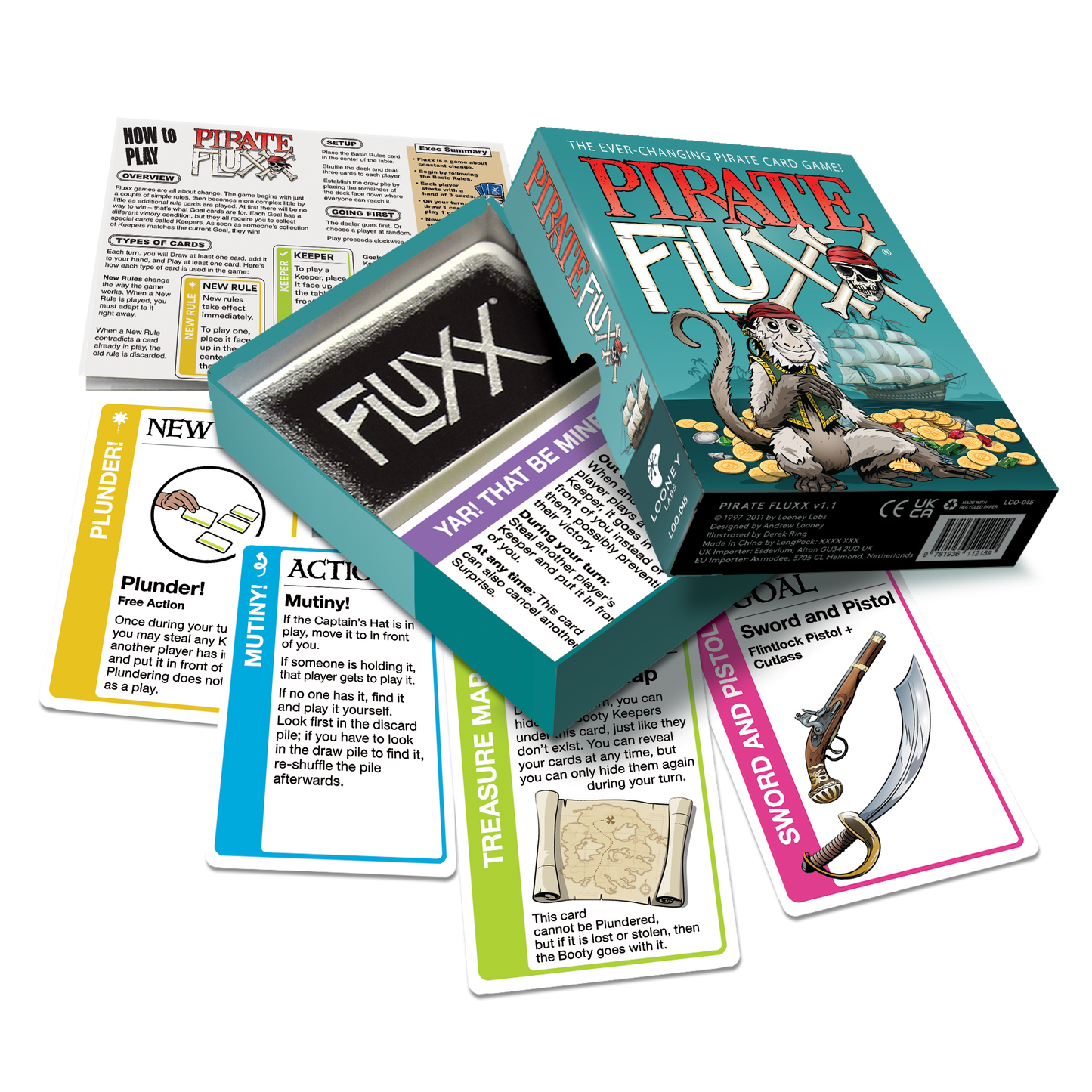 Yarr! Grab yer Cutlass! Pirates have taken over Fluxx, the ever-changing card game, and their rules be new and strange. There'll be times ye must Talk Like A Pirate, and rules about how ye can Plunder from yer mates. But the most excitin' treasure fer Fluxx fans new and old is the Surprise! - a card type that you play out of turn! Your trusty Monkey can watch over the Gold Doubloons while you commandeer Ships on the high seas, but only Fruit can protect you from Scurvy. You'll enjoy the privileges of wearing the Captain's Hat... but watch out for Mutiny amongst the crew!