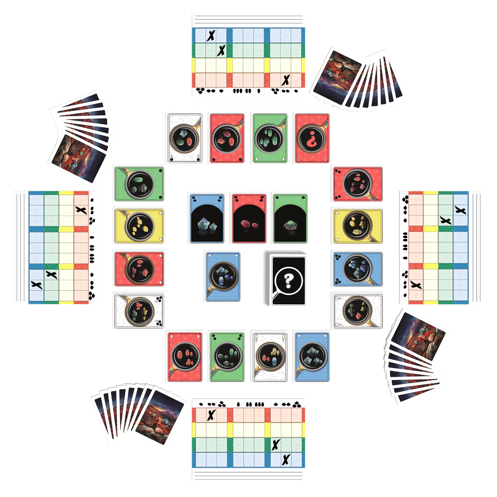 Sleuth is the timeless classic deduction game by legendary designer Sid Sackson. Players are searching for a missing gem, one of the 36 Gem cards which has been removed and hidden before the start of the game. The 35 remaining Gem cards are distributed among the Players, with extras publicly displayed. Using logic and deduction, and cards from the Search deck, players question their opponents for evidence as they race to win by being the first to identify the missing gem.