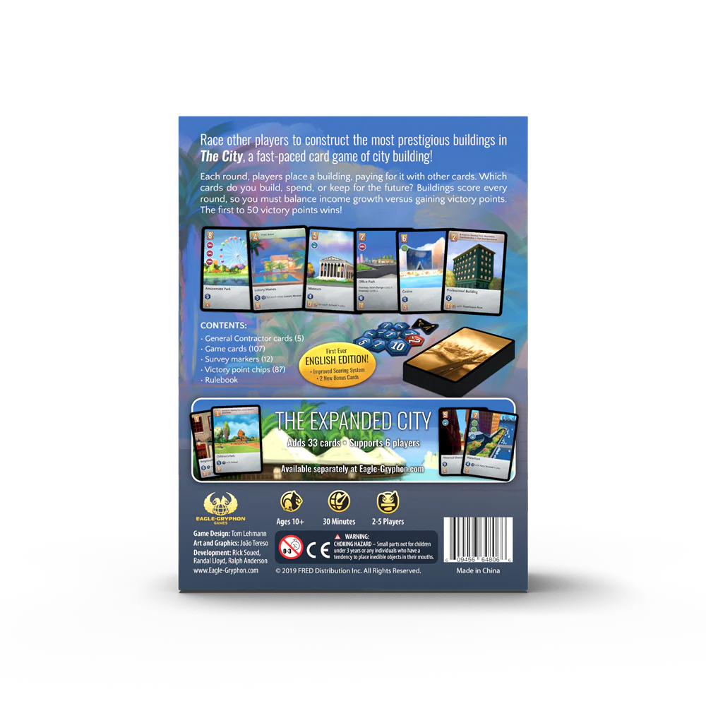 In The City, players try to quickly and skillfully build their own city over the rounds, bringing in revenue and victory points (VPs). The cards are both buildings and currency, and the first player to collect 50 victory points wins the game. Victory points are cumulative from round to round, so a fast start yields a big advantage.