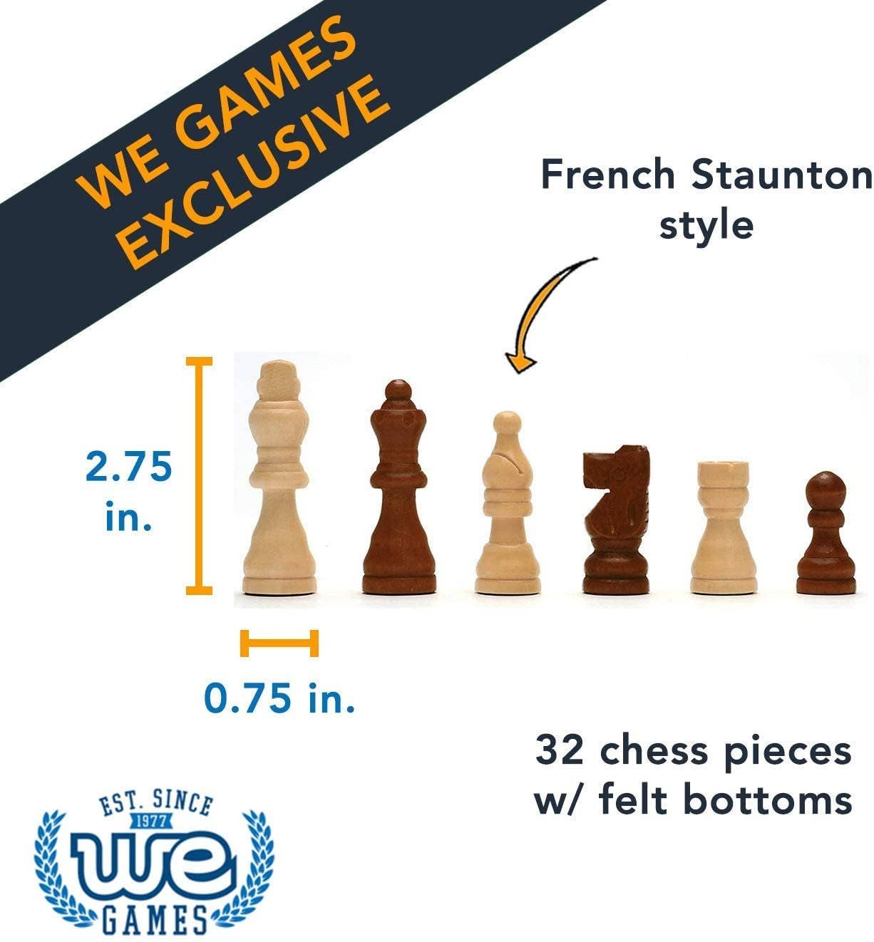 This is a lovely set for the chess player seeking an entry level wooden chess set that will not break the bank. The chess board is moderately sized is crafted from walnut veneer with a solid walnut wood border. Walnut is a hard wood which is highly desired for its rich, dark hues. The unweighted wooden chess pieces are carved into the traditional Staunton style.