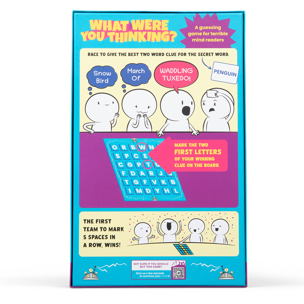 Are you fast enough?: What Were You Thinking? is a board game that makes you race against your opponents to give the perfect clue. It's a guessing game where you flex your creativity, get competitive, and think fast!