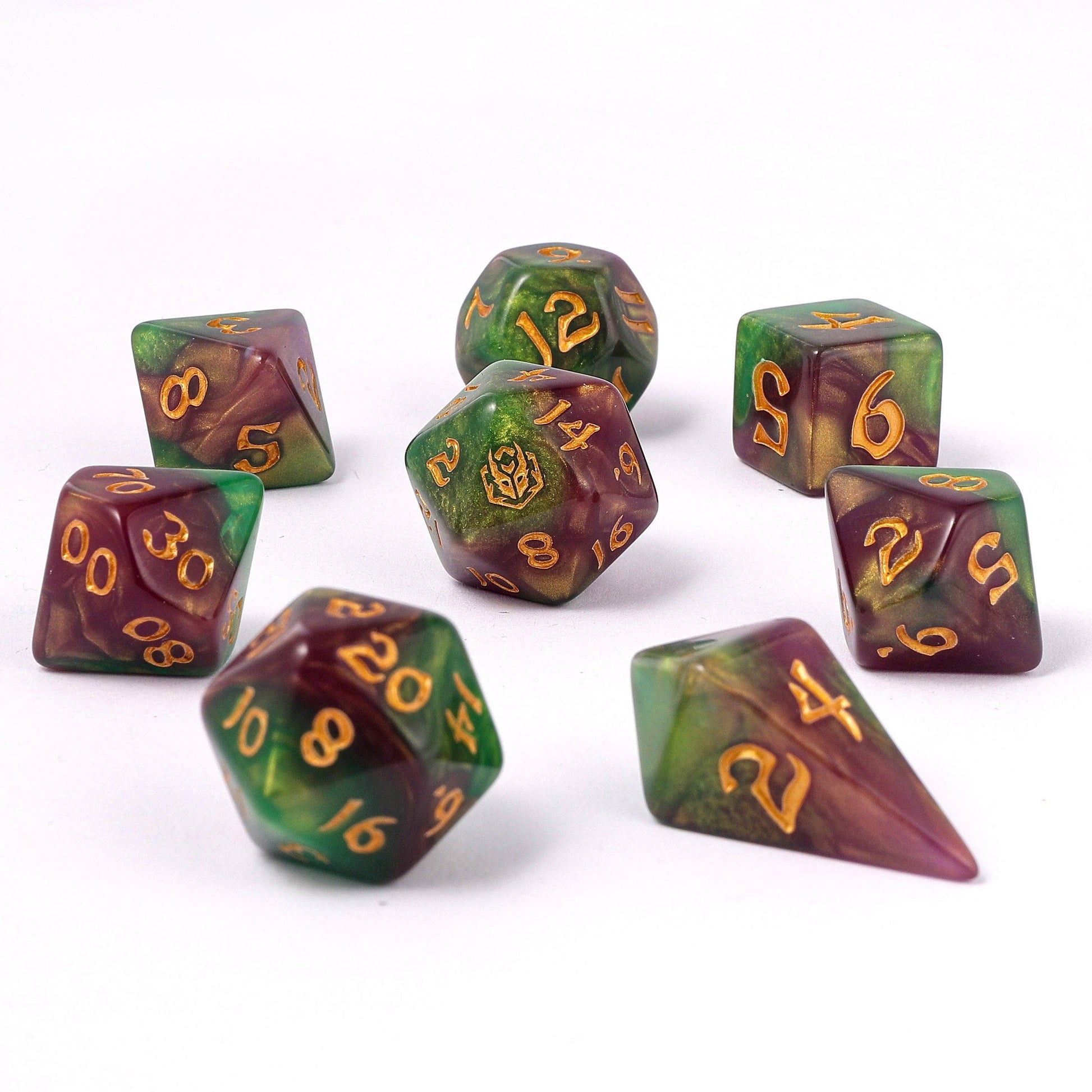 These rounded edge dice sets are larger than most and feature a second D20 and unique shaped D4.