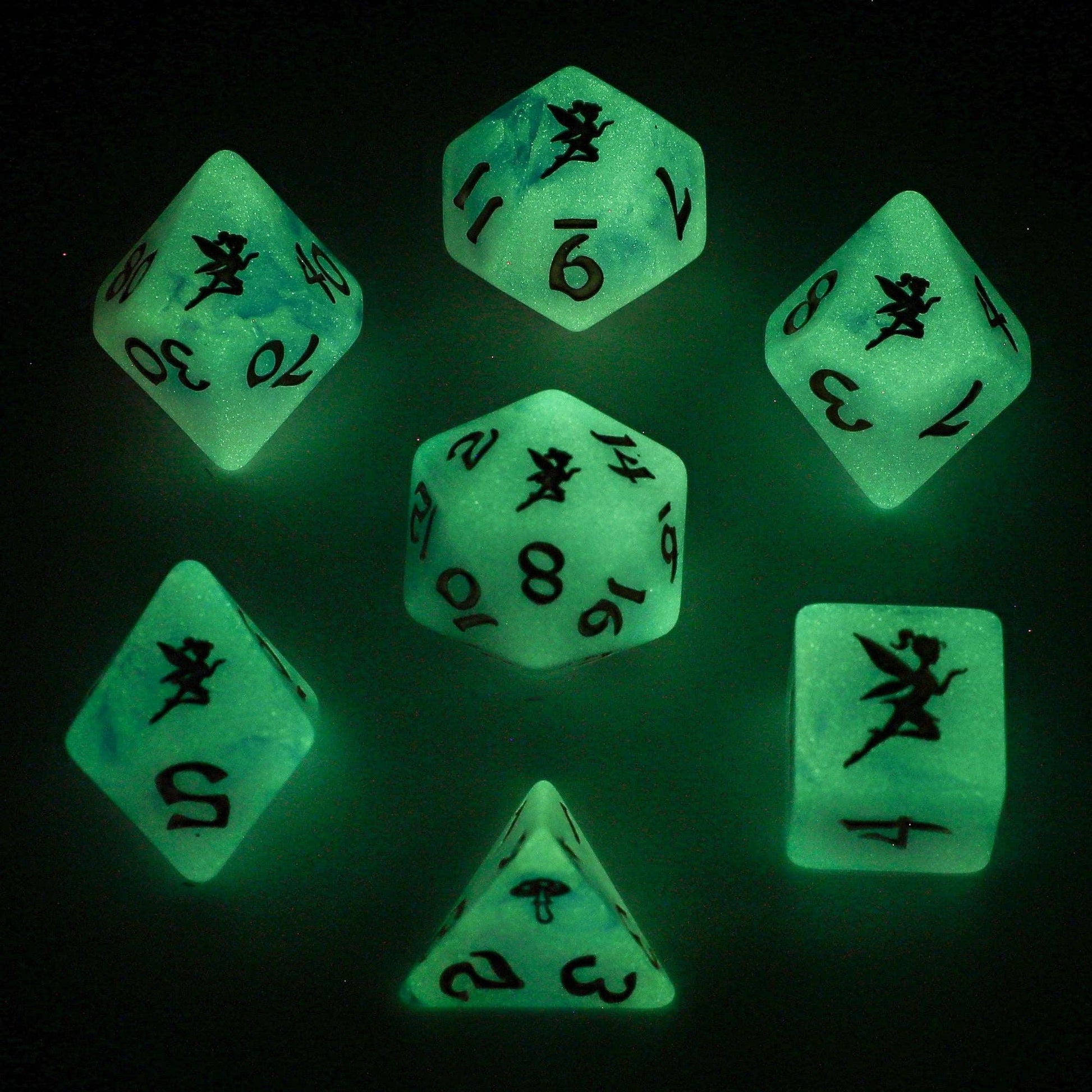 These rounded plastic dice sets are larger than most and feature a fantasy themed symbol on the high sides. The Pixie Dust sets glow in the dark!