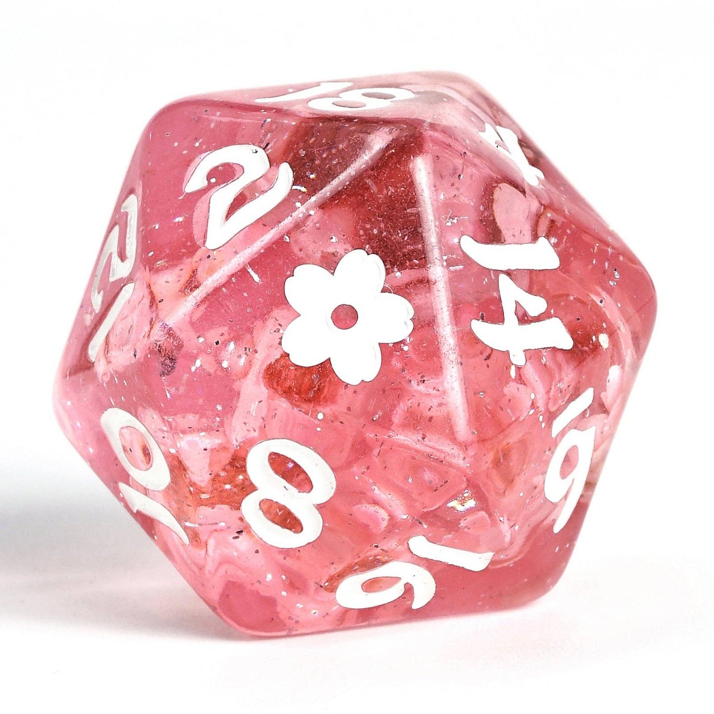 These rounded resin dice sets are larger than most and feature a symbol on the Sakura Blossom design on the high sides.